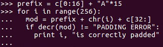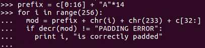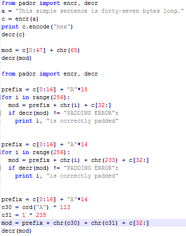 - Alright, we import the library, which we already had anyway. Here we leave the first 16 bytes unchanged and fill in 15 bytes with A. Then, we have the loop that changes the next byte's every possible value and leave the third block of data unchanged. We run through the loop until we no longer get a padding error. This tells us that 234 is the value that gives us correct padding: