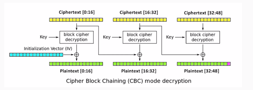 The first block of data is unmodified. The second block and most of the third block have changed to random characters, but we controlled the last two bytes and we could make them say anything we wanted. So, we are able to create ciphertext that will decrypt at least partly two values we choose, even though we don't know the key or the initialization vector.