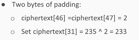 - Leave the first block unchanged and add 14 bytes of a vary the next byte. Leave the byte at the chosen value of 233 so you know that the final byte of the decrypted output will be 2, and when the padding error message goes away, you can take that number, XOR it with 2, and you get the next value of the intermediate. So, now we can make messages. We would have to repeat this more times to get more bytes, but for this demonstration, we'll settle for a message just one letter long. We'll make an A followed by a binary value of 1 for valid padding. That's our goal, and in order to do that, all we have to do is set ciphertext 30 and 31 to these chosen values: