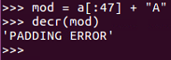 Now, we should do the deformed one. If we set our modified text equal to the original plaintext going up to character 47 and then we add "A" at the end, when we decrypt it, we get 'PADDING ERROR':