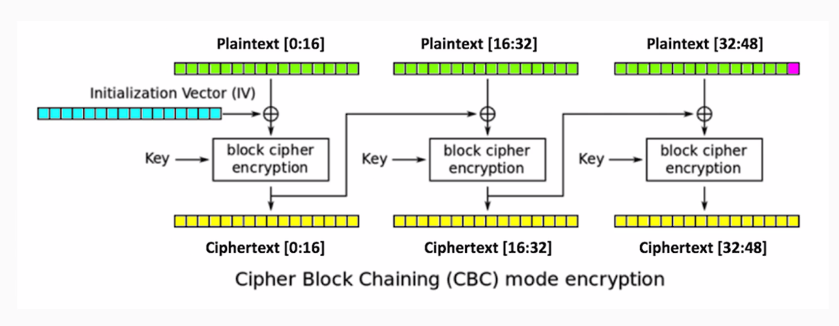 We'll have three blocks of data, each 16-bytes long. We'll encrypt the data with AES in CBC mode, so in comes the initialization vector and the key. You produce three blocks of ciphertext, and each one of the blocks after the first uses the output of the previous encryption routine as an initialization vector to XOR with the plaintext.