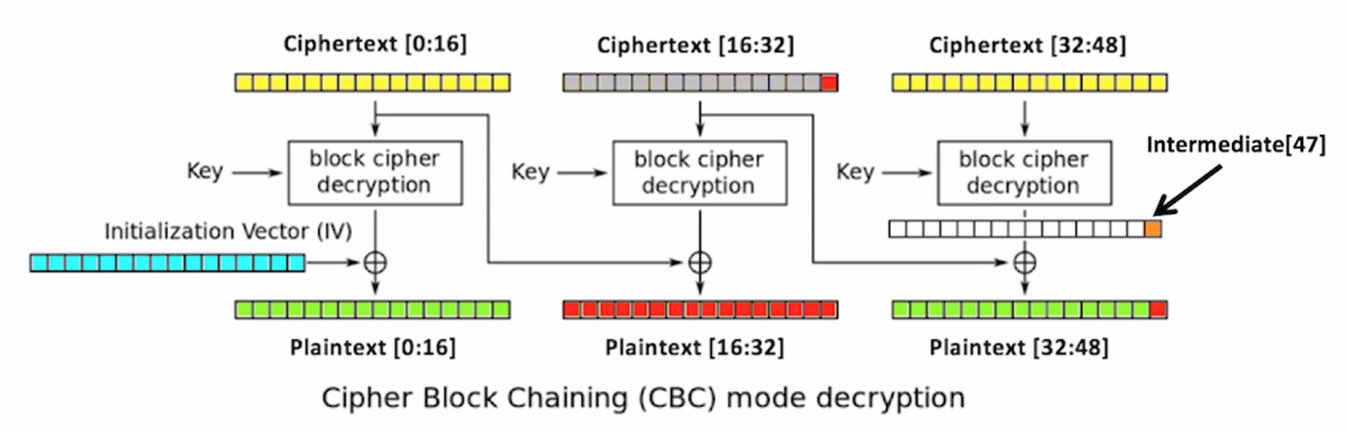 Leave the first 16 bytes of the ciphertext alone. Change this to anything you like, such as all-As, and then decrypt that. What will happen is, because you changed the bytes in the second block, the second block will turn to random characters, and so will the third block. But it'll give you a padding error unless the, very last byte of the very last block is one. So, you brute force it. You change a byte to all 256 possible values until the byte becomes 1, and when that happens, you know this value is 1. You know this value because it's the one that did not give you a padding error message, and you can XOR them to determine this intermediate value right here. So, proceeding byte by byte to the left, you can determine these intermediate values. If you know them, you can put in ciphertext that will make anything you like appear in the third block. So, you can defeat the encryption even though you don't know the key or the initialization vector.
