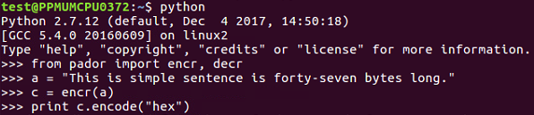 Here is an example of a vulnerable system that you can attack. This is just using the same techniques we've made before where we just encrypt things with AES and CBC mode, which you can save in pador.py, and then you can just import it to make it easy to use and more realistic. There have been real systems that use this. So, we import, encrypt, and decrypt methods so that we can put in a 47-pipe message and encrypt it. We'll get a long blob of hexadecimal output.