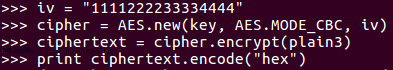 We just need 16 bytes, so we'll just 16 bytes to iv. Next, we create a new AES object. In the iv now, we encryp plain3 again, and we print out the result again.