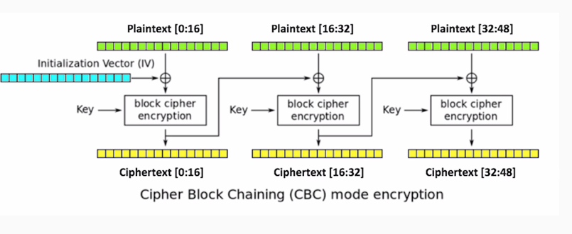 AES mode CBC when you create the cipher object. You also have to provide an initialization vector, which can be 16 bytes, just like the key. If you encrypt one block of 16 bytes of text, there's no obvious difference in the result because of the initialization vector, but it's just a block of hexadecimal. To see the effect of this, you need to make the plaintext longer. When you encrypt it, you get a blob of hexadecimal. That's the ECB mode, which does not remove all the patterns in the data. Here's the CBC mode with the same repeating input. As you can see, the output has no pattern, and does not repeat however far you go. So, it much more effectively conceals the data.