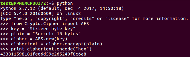 So, you can see the 16-byte key and the 16-byte plaintext AES in ECB mode. We encrypt it and print the answer.