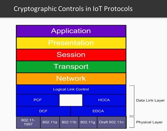 When we talk about using cryptography within IoT, we are talking about using cryptography across many layers of the communication stack. If we look at the OSI model, we can see that crypto is used at Layer 2 and up with linking operating at level 2, networking operating at layer 3, and transporting operating at layer 4: