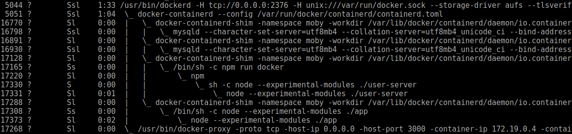 The claimed advantage Docker has over virtualization approaches, such as VirtualBox, is that Docker is very lightweight. We see right here why Docker is lightweight: there is no virtualization layer, there is only a containerization process (docker-containerd-shim).