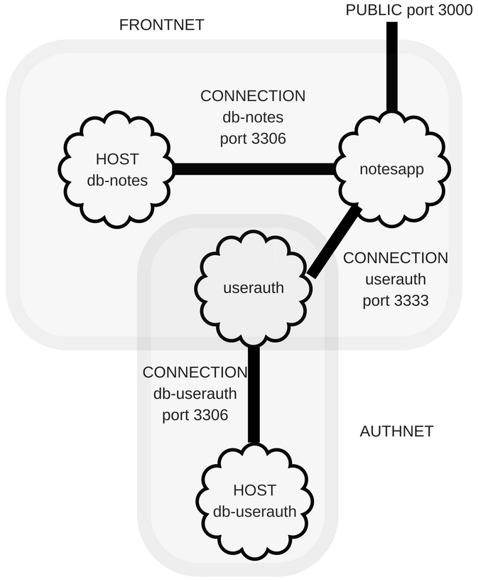 One strategy to enhance security is to expose as few ports as possible. That reduces the so-called attack surface, simplifying our work in hardening the application against security bugs. With the Notes application, we have exactly one port to expose, the HTTP service through which users access the application. The other ports, the two for MySQL servers and theĀ user authentication service port, should be hidden.