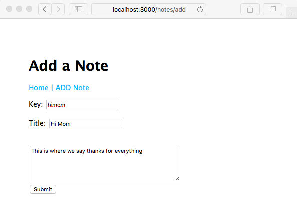 Notice that the note and notekey objects passed to the template are empty in this case. The template detects this condition and ensures the input areas are empty. Additionally, a flag, docreate, is passed in so that the form records whether it is being used to create or update a note. At this point, we're adding a new note, so no note object exists. The template code is being written defensively to not throw errors.