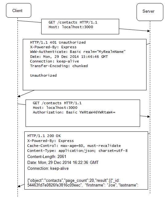 Whenever an HTTP request is sent to an endpoint secured by HTTP basic authentication, the server replies with an HTTP 401 Unauthorized status code, and, optionally, with a WWW-Authenticate header. This header forces the client to send another request, containing the Authorization header, which specifies that the authentication method is basic. This request is followed by a base64-encoded key/value pair, providing the username and the password to authenticate with. Optionally, the server can specify a message to the client with the realm attribute.