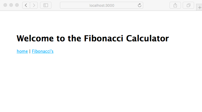This page is rendered from the views/index.hbs template. Simply click on the Fibonacci's link to go to the next page, which is of course rendered from the views/fibonacci.hbs template. On that page, you'll be able to enter a number, click on the Submit button, and get an answer (hint: pick a number below 40 if you want your answer in a reasonable amount of time):