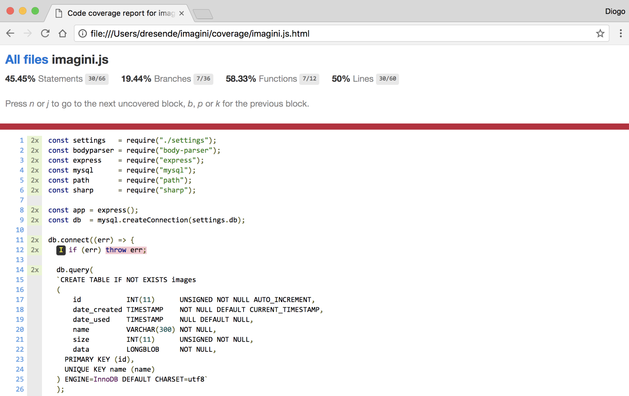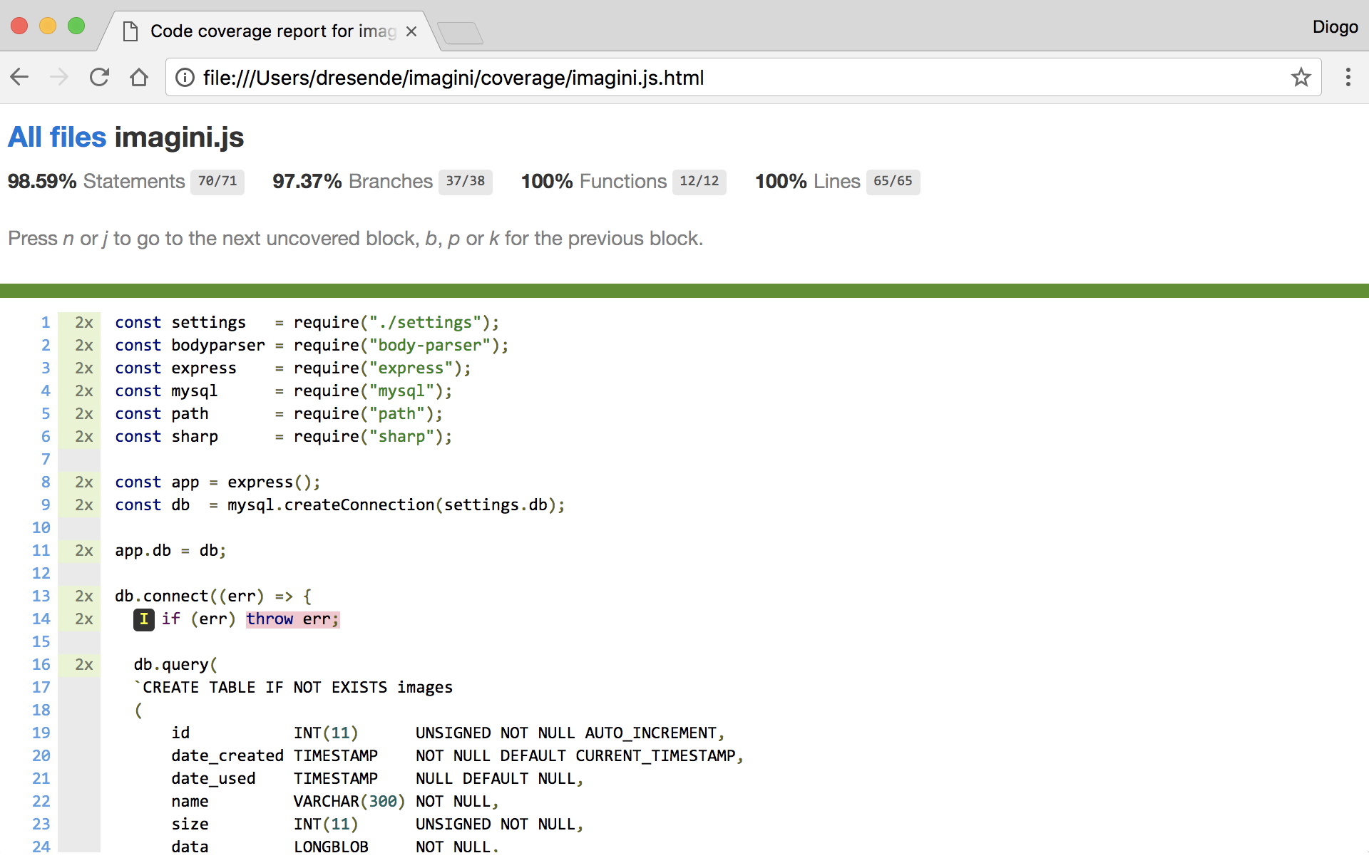 We now reach 100% coverage on functions and lines. There's only one branch, with one statement missing. It's the possibility of a connection error: