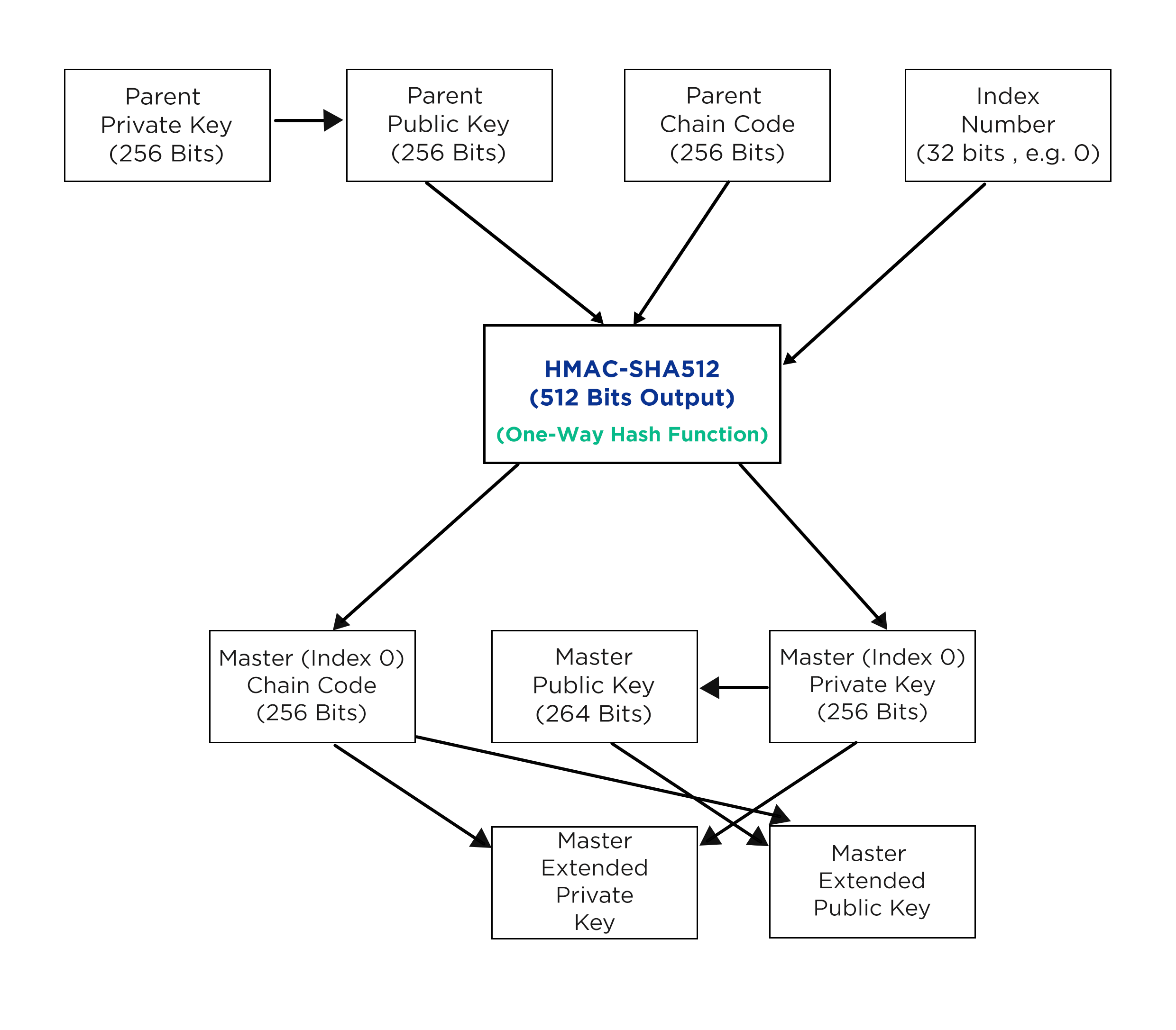 An extended private key has the xprv prefix in the key's Base58Check, while an extended public key has the xpub prefix in the key's Base58Check. The following diagram show's how extended keys are formed: