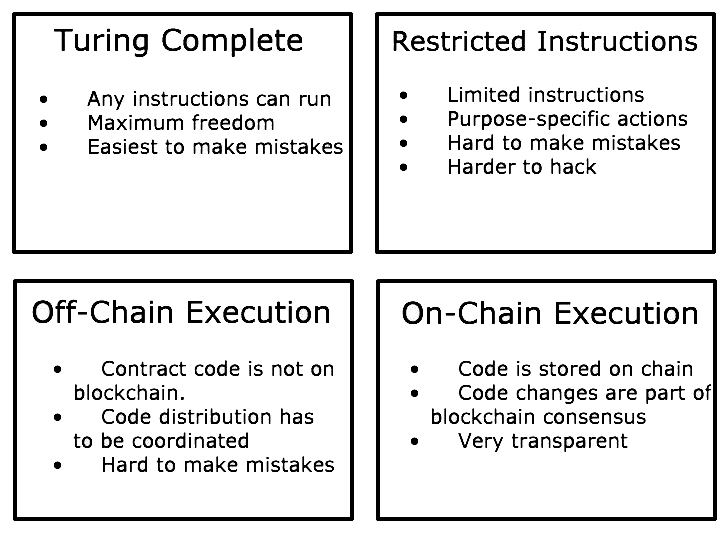 In general, the various smart contract approaches can be divided into different types: Turing Complete, Restricted Instructions, Off-Chain Execution, and On-Chain Execution, as shown in the following figure: