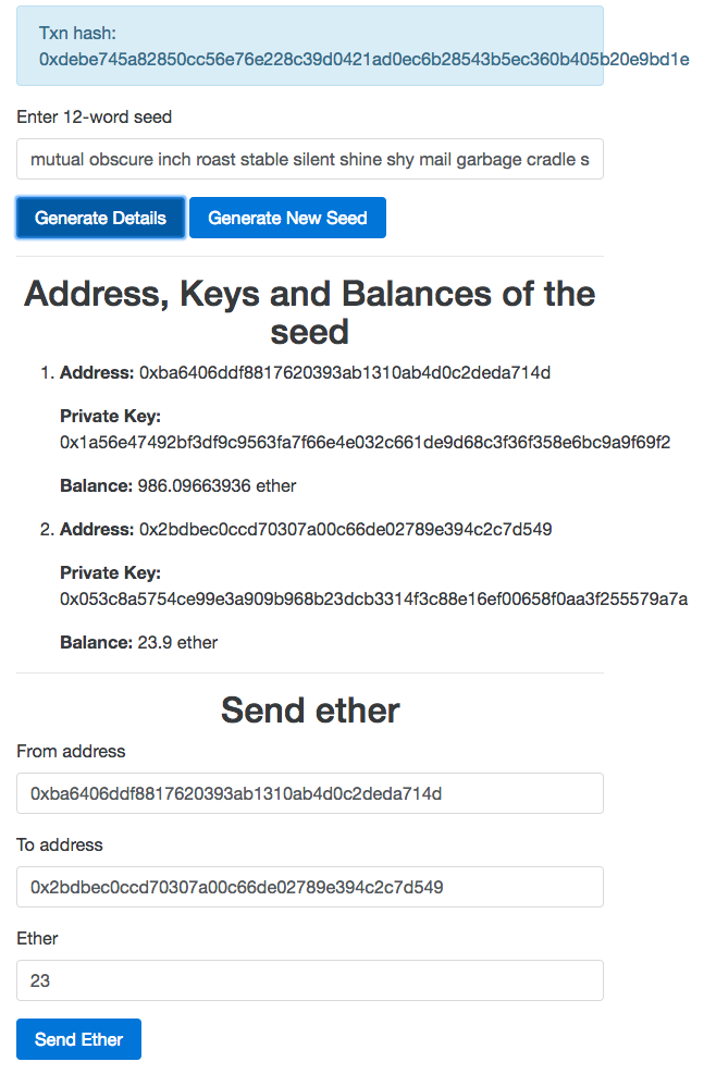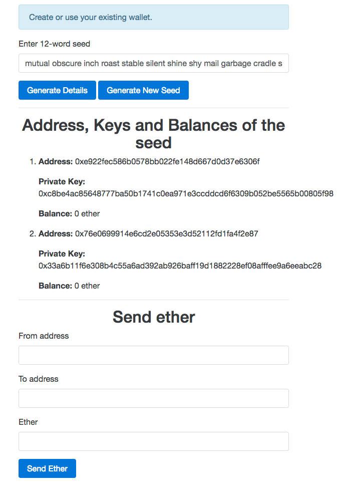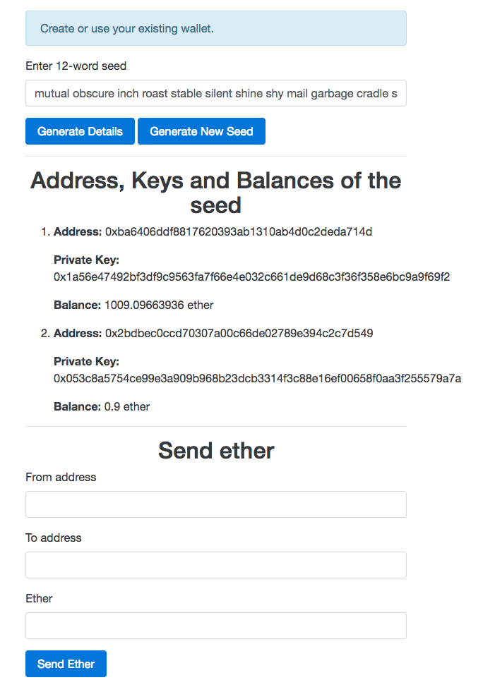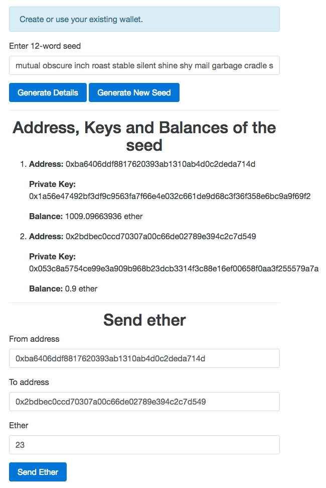 Now to test sending ether, you need to send some ether to one of the generated addresses from the coinbase account. Once you have sent some ether to one of the generated addresses, click on the Generate Details button to refresh the UI, although it's not necessary to test sending ether using the wallet service. Make sure the same address is generated again. Now the screen will look something like this: