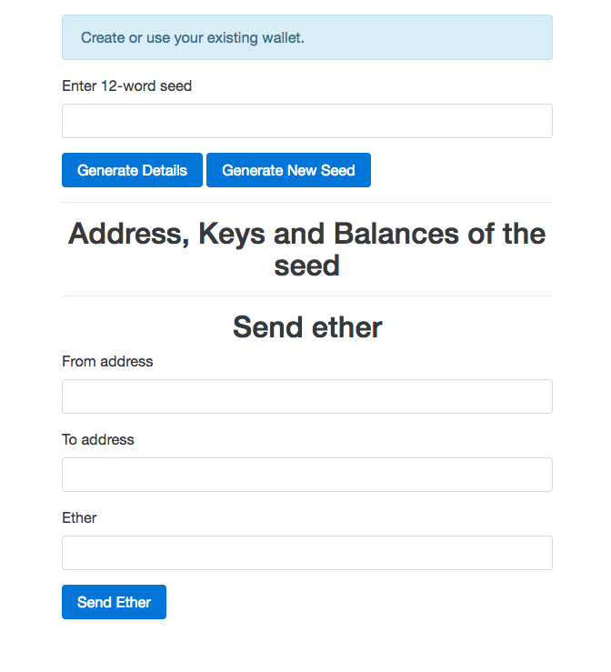 Now click on the Generate New Seed button to generate a new seed. You will be prompted to enter a number indicating the number of addresses to generate. You can provide any number, but for testing purposes, provide a number greater than 1. Now the screen will look something like this:
