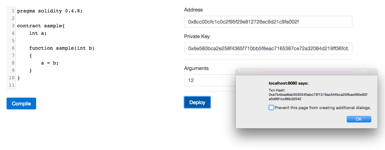 This code is self-explanatory. Make sure that in the validators array replaces the addresses with the first address of validator 1 and validator 2 nodes as we will be using those addresses for validation. Now compile the preceding contract using whatever you feel comfortable with.